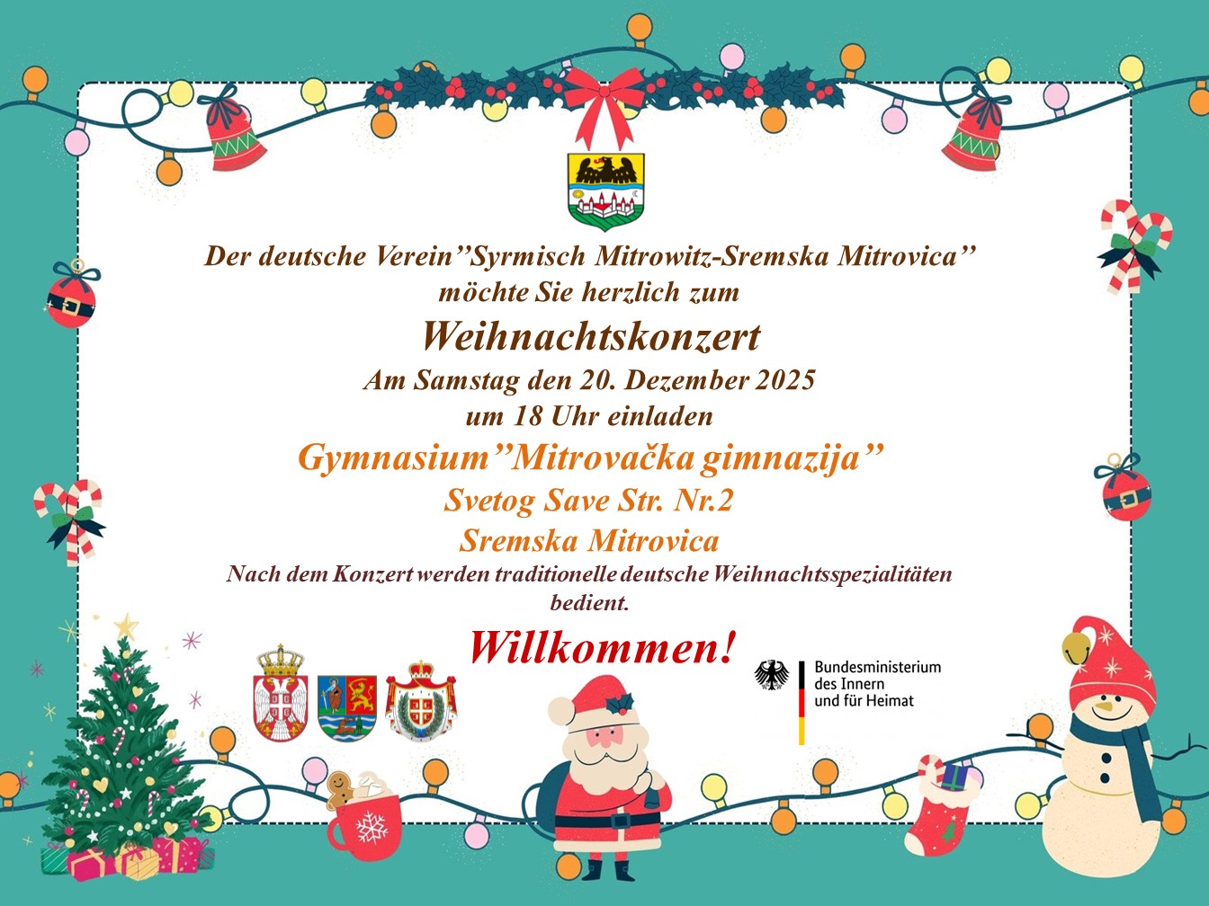 Wir laden Sie herzlich zum Weihnachtskonzert des Deutschen Vereins „Syrmisch Mitrowitz“ – Sremska Mitrovica am Samstag, den 20. Dezember 2025 um 18:00 Uhr ein. Das Konzert findet in Gymnasium ,,Mitrovačka gimnazija" (Svetog Save Straße Nr. 2) in Sremska Mitrovica statt. Es wird ein festliches Weihnachtsprogramm präsentiert vom:
