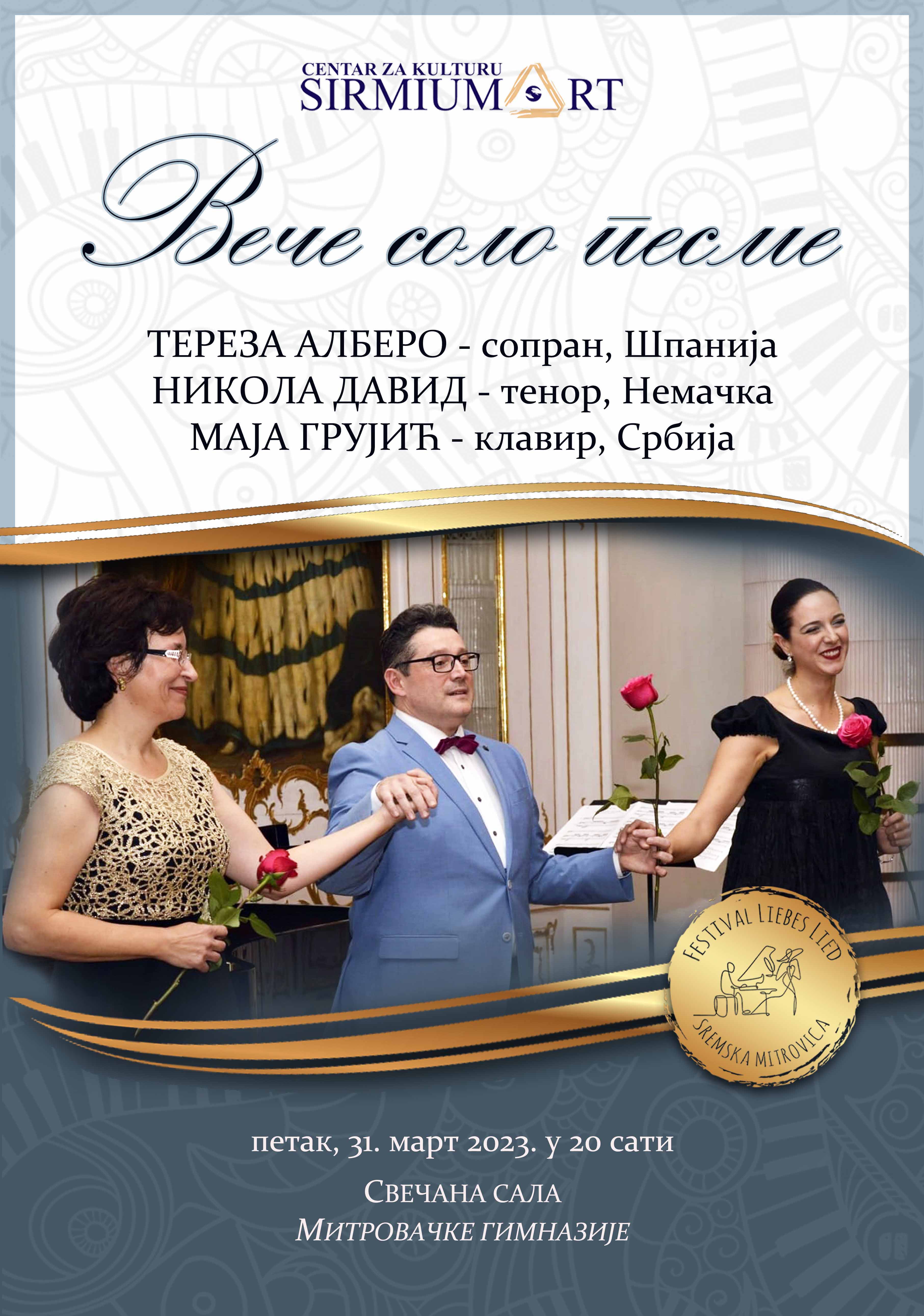 Udruženje Nemaca ,,Syrmisch Mitrowitz'' - Sremska Mitrovica srdačno vas poziva na Veče solo pesme, koje će se održati u svečanoj sali ,,Mitrovačke gimnazije'' 31.3.2023. godine od 20 časova.